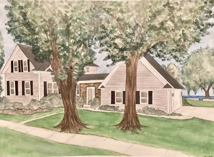 I created this painting after learning that my parents had decided to sell our childhood home. I feel sadness over the loss of a house that carries the memories that were created in it. My parents created a home for me and my siblings. I don’t feel sad about leaving this house behind, though. My parents sold this house because they decided to purchase my dad’s childhood home. My grandfather came from very little and he worked hard to provide everything for his family. I learned a lot about my grandpa after he passed away. He gave his heart and soul to his work and to his family. He gave everything to create a home, and in my parents’ selling of my childhood home, they purchased a different childhood home of mine. I don’t feel sad about leaving this house because my childhood memories exist in this home as much as they exist in my grandparents’ home.